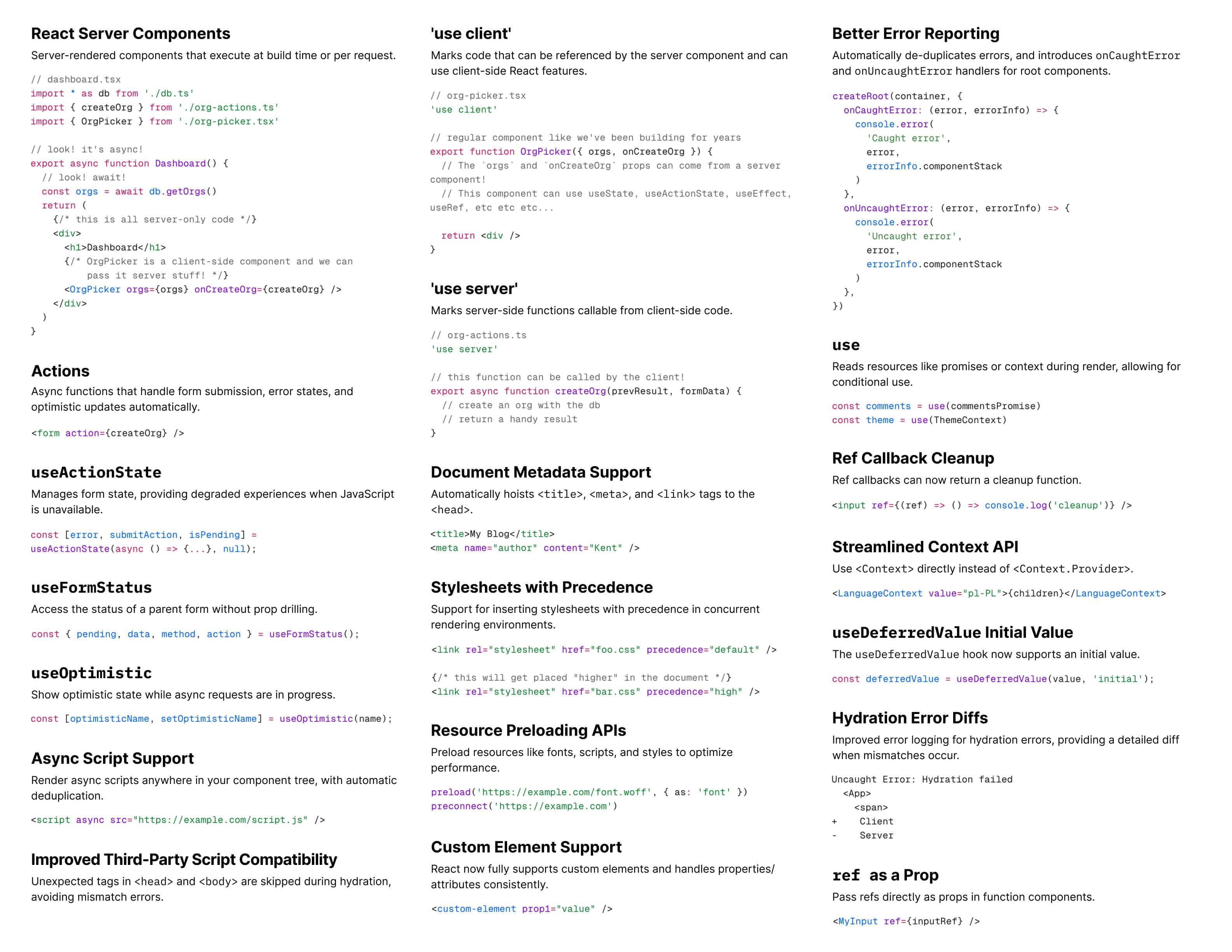 오류를 자동으로 중복 제거하고, 루트 컴포넌트에 대한 onCaughtError와 onUncaughtError 핸들러를 도입합니다.